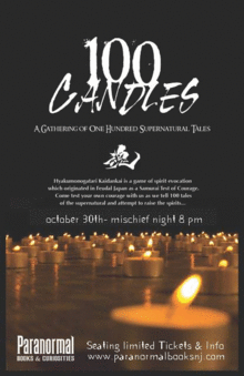 100 Candles- A Samurai Seance-Mischief Night Hyakumonogatari Kaidankai (A Gathering of One Hundred Supernatural Tales) was a paranormal parlor game during feudal Japan. In a room, as night fell, one hundred candles are lit. Guests and players gather around the candles, taking turns telling ghost stories. After each story, a single candle is extinguished. The room slowly grows darker and darker and the spirit world grows closer and closer. When the final candle is blown out, it is believed that a spirit will be able to cross over and manifest itself. The evocation game is thought to have been originally created as a samurai test of courage.