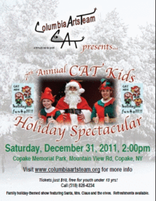 The CAT Kids Holiday Spectacular, now in its seventh year, showcases fun entertainment by special guests, including holiday music by the pop!ternatives folk trio; juggling, and magic among other surprises. In addition to the professional performers, this year's show also features young participants from the CAT Youth Theater Workshop, including Stephanie Brodsky and Meagan Conway. Following the show, Santa, Mrs. Claus and the elves greet children and offer special gifts.