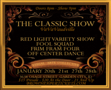 find out more about the performers: http://www.frimfram4.com/ http://www.foolsquad.com/ http://site.offcenterdance.org/ http://www.facebook.com/pages/The-Red-Light-Variety-Show/117879393589