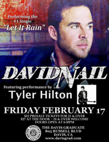 Nashville recording artist David Nail will be performing a live concert at The Davis Graduate on Friday, February 17, 2012. The Grad is excited to feature one of country music's bright young stars. The concert will include Mr. Nail's full back-up band.