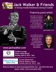As part of the continuing RMI Concert Series, "Jack Walker & Friends" will appear at Green Valley Ranch Resort on April 8 and Aliante Station Casino & Hotel on April 22. Walker's "friends" in April's concert series include singer/actor Lou De Meis and Virtuoso concert pianist Garin Bader. Enjoy an evening of quality entertainment, dancing and cocktails in state-of-the-art showrooms at Station Casinos.