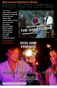 The 3rd Annual Rog's Birthday Valentines Event featuring Rog and Friends, The Daily Flash and performances by a host of Rog's musician fiends and collaborators including: AURY, PAMELA MOORE BERNADETTE BASCOM GOLDY MCJOHN JASON AMES JERRY, JOSEPH MILLER KELLY MITCHELL LEE OSKAR MIKE DEROSIER RANDY HANSEN SOMAR MACEK STEVE FOSSEN THE ARMY THE 350'S TOMMY PLATINUM