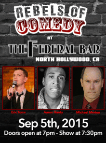 It's Rebels of Comedy at the Federal Bar in North Hollywood. Come out and see a night of live comedy, featuring an awesome lineup of professional features and headliner comedians. Hosted By Eric Toms, with Headliners Aaron Hardy, Michael Merton