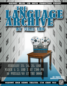 George is a brilliant linguist whose life work is capturing the world's vanishing languages. Speaking of vanishing, George's wife is headed out the door because he can't find the right words to express himself. At work, George's assistant is mute with adoration for him. Enter the last two speakers of the Ellowan language, the long-married Alta and Resten, a funny and fractious truth-talking couple. Cho's magical prize-winning tale, loaded with life's contradictions, love and loss, happiness and pain, endings and beginnings, explores the force and failings of words. (Taken from the Oregon Shakespeare Festival website, http://www.osfashland.org/browse/production.aspx?prod=205)