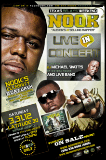 Brief Biography: NOOK is taking the world by storm with inspiring, poignantly crafted, bold lyrics and an energetic performance style that captivates many audiences throughout the nation! As to date, NOOK is the most accomplished rapper in central Texas. He was the first local" artist to ever have a song played on commercial radio in Austin. He is the creator of the Jump On It Concert Series that was declared the largest outdoor urban concert series in Texas from 1997 - 2002. NOOK is an artist whose passion of greatness for himself and his community fires everything he does. He speaks truthfully and wittily about his view of life in a way that all who hear it feel it. Throughout the years NOOK has earned a reputation for excellence as a writer, rapper, leader and innovator of creative options for youth. He's a Drop Out Prevention Spokesperson for AISD, produces radio & tv advertisements and music workshops resulting in lots of press coverage including tv appearances. NOOK has been mentioned in Billboard Magazine and Blaze Magazine and named Top 25 under 25 in America" by the Future 500 Magazine.