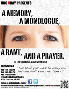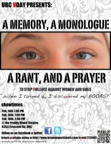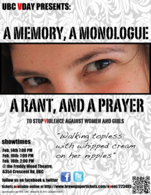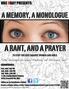 To check out: Vagina Monologues Go to: http://www.brownpapertickets.com/event/223400
