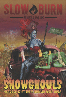 Slow Burn Burlesque is pleased to bring you "Show Ghouls", our Halloween, burlesque, gore-fest extravaganza! On Saturday, October 17th, Slow Burn Burlesque escapes from the belly of Hell and onto the stage of the Howlin' Wolf to unleash our most terrifying and tantalizing performances upon your soul. Featuring insane sideshow, cutting edge variety, and the most seductive striptease in town! This year we're taking terror to the next level with devilish performances by Nikki Le Villain, Xena Zeitgeist, Ruby Rage, Roxie le Rouge, Lady Lucerne, Lydia Treats and from Seattle Washington, Jesus la Pinga. And there to hold your hand on this deviant road to hell is your host Ben Wisdom! We'll also have authentic tarot readings by Little Luna! Give in to your desires! Join the voluptuous vampires, debaucherous devils, glamorous goblins, decadent demons, burlesque banshees and the hottest Show Ghouls in New Orleans and the entire World! Beware the Babes who go bump in the night! Saturday, October 17th, 2015 Howlin' Wolf 907 S. Peters New Orleans Doors at 10:00p.m. Show at 11:00p.m. Reserved Seating $25 Standing Room $15