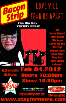 Bacon Strip The Big Gay Variety Show, is bringing back a yearly favorite Goth night with Love will Tear Us Apart! Come down to Rebar for and evening of black velvet, black eyeliner and fishnet! The Bacon Strip family will be performing everything from Goth classics to dark performance art. Sylvia O'Stayformore and the cast of kooks will bring you a night of surprises and mayhem with some meaty bacon thrown in.