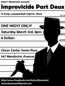 Improvicide Part Deux For the second year in a row Actor's Basement is happy to present Improvicide - a truly unexpected improv show. Anything and everything might happen onstage - from a live alien birth to manslaughter to a delicate and poignant exploration of stamp collecting. Watch it all unfold for the very first (and last) time! Saturday March 3rd - One night only! Doors open at 7pm, show starts at 8pm