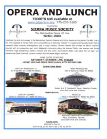 Sierra Music Society fundraisers are social formats to engage attendees to help raise money for our organization's programs. We are excited to present our newest fundraiser "Opera and Lunch" which will offer ten dates beginning October 3, 2015 and running thru April 30, 2016. All events are advertised separately and you can choose to attend one, two, or all of them! This fundraiser includes a ticket to The Metropolitan Opera HD Live, at your choice of two local Cinemarks; a prepaid Lunch at a specific restaurant near the Cinemarks; and a chance to support Sierra Music Society all at the same time! You will sit with other like-minded opera enthusiasts and discuss the performance over lunch. This all-inclusive fundraiser is $45. Prepaid reservations are available now. Please go to www.poperanv.org to sign up!