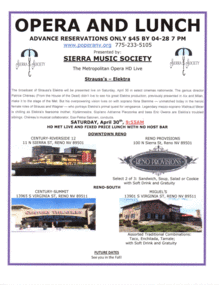 Sierra Music Society fundraisers are social formats to engage attendees to help raise money for our organization's programs. We are excited to present our newest fundraiser "Opera and Lunch" which will offer ten dates beginning October 3, 2015 and running thru April 30, 2016. All events are advertised separately and you can choose to attend one, two, or all of them! This fundraiser includes a ticket to The Metropolitan Opera HD Live, at your choice of two local Cinemarks; a prepaid Lunch at a specific restaurant near the Cinemark; and a chance to support Sierra Music Society all at the same time. You will sit with other like-minded opera enthusiasts and discuss the performance over lunch. This all-inclusive fundraiser is $45. Reservations are available now and are prepaid. Please go to www.poperanv.org to sign up.