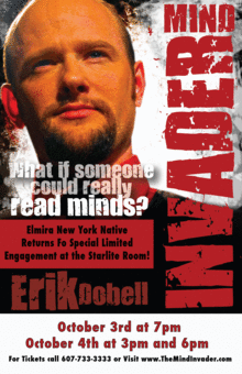 After traveling the world from New York to South Korea, Elmira native Erik Dobell is bringing his mind reading show back to it's roots for a special performance of The Mind Invader at the Starlight Room on October 3rd at 7pm and October 4th at 3pm and 6pm.