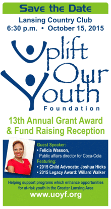 The Board of Directors of the Uplift Our Youth Foundation is pleased to announce that we are hosting our 13th Annual Grant Awards and Fund Raising Reception on Thursday, October 15, 2015 at the Lansing Country Club, located at 2200 Moores River Drive. The reception will begin promptly at 6:30pm.