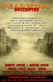 Funhouse Lounge is proud to present Deadwood Unscripted! Unscripted episodes of HBO's infamous and critically-acclaimed, hit television series improvised before your very eyes.
