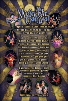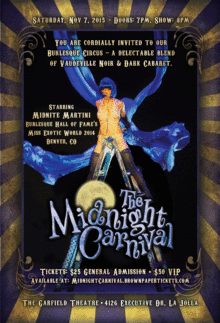 You are cordially invited to "The Midnight Carnival" - a dark, brooding concoction of Vintage Gothic Burlesque Circus with a devilish hint of whimsical Vaudeville Noir. When exquisite creatures of the nether-realms come out to play in the dead of night! Libertines, jezebels and ecdysiasts will mesmerize you with their intoxicating Danse Macabre.
