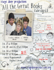 Stage Door Productions is presenting it's first plat of the new year with its comedy "All the Great Books (abridged)," a play that condenses 86 classics of world literature into 90 riotous, laugh-filled minutes. The three cast members (Kimberly Kemp, Jon Gardner, and Rudy Lane) use every weapon in their comedic arsenal to prepare their students (the audience) to pass the final exam in Western Literature. Slapstick, cross-dressing and goofy jokes abound in this play written by Reed Martin and Austin Tichenor of the Reduced Shakespeare Company. Moby Dick. Little Women. The Odyssey. War and Peace. Does the mere mention of these classic book titles make you cringe with painful high school memories? If so, there may still be hope for you to salvage a little enjoyment out of these classic works by taking in a performance of All the Great Books (abridged) as made famous by The Reduced Shakespeare Company.