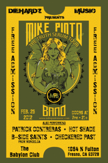 Diehardz Music Presents: "The Mike Pinto Band" from San Diego,Ca A night of--> Reggae/Rock on Feb. 25th at The Babylon Club w/ Patrick Contreras, B-Side Saints (Merced,Ca), Hot Shade, Checkered Past. It's no cover, Free show!! 21 ++ Doors open @7pm