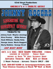 Johnny Rogers has been voted the # 1 tribute Artist in America. He is best known for his amazing portrayal of Rock Pioneer Buddy Holly. He also does a Tribute show to the Legends of Country. He is bringing both shows to the Red Barn over two nights. Accompanying Rogers is guitar legend and Grammy Winner, Tommy Allsup. It was with Tommy that Ritchie Valens won the famous coin toss which put Ritchie on the plane with Buddy Holly & the Big Bopper that then crashed;the "day that the music died." To meet Allsup is to touch a part of music history. Performing on stage with some of the biggest names in music,Rogers has entertained 4 U.S. presidents and count them among his many fans. His stage presence echoes the King of Rock n' Roll and the guitar licks of Chet Atkins and Jimi Hendrix. Top Nashville Grammy Producer Daryl Bledsoe says, "he is one of the best entertainers in the music business. "Don't miss your chance to see this high energetic performance. All ages are invited to attend. The Jonny Rogers Shows will amaze you. Choose your favorite: Country Legends (Oct,2), Rock n' Roll Legends(Oct.3), or Both. Offered is a 2 Night package Advance Tickets ONLY for $30.00 total. 2 Nights of incredible music. You will not be disappointed!