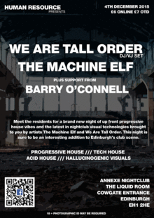 Meet the residents for a brand new night of up front progressive house vibes and the latest in nightclub visual technologies brought to you by artists The Machine Elf and We Are Tall Order. This night is sure to be an interesting addition to Edinburgh's club scene.