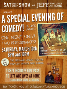 Paramount Pictures and The Saturday! Saturday! Show present a very special evening of comedy with LA Times "Top Pick" comedy group ROBERT DOWNEY JR JR and friends! There will be laughs, surprises & free drinks!