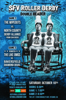 6:30 pm: Doors open 7:00 pm: Wipeouts vs. North County Derby Alliance:: 7:00 PM 8:30 pm: Like OMGs vs.Bakersfield Diamond Divas