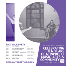 Abbey Arts Ten Year Anniversary (10 Events, 10 Days) Celebrating a decade of arts & culture for all ages & incomes. Join in the fun and support Seattle's creative community as we empower the next 10 years of Abbey Arts programs and events. With over 31,000 attendance at our events and programs annually we are growing fast in 2015-16. Abbey Arts needs your support to provide more arts & culture opportunities for people of all income levels.