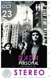 Un tributo en Stereo en Mi Barra Bar Cupo limitado, Solo para miembros Nada Personal Regresa para interpretar los grandes exitos de la banda mas representativa en la historia del rock latinoamericano SODA STEREO y repasando algunos de los temas solistas de su lider Gustavo Cerati.