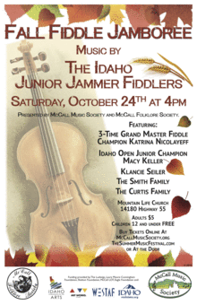 In a joint endeavor, McCall Music Society and McCall Folklore Society are proud to welcome The Idaho Junior Jammer Fiddlers and special guests to the Fall Fiddle Jamboree on Saturday, October 24th at 4PM at Mountain Life Church, 14180 Highway 55 in McCall.