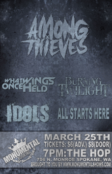 Among Thieves, What Wings Once Held, Burning Twilight, Idols and All Starts Here play an all ages Spokane show