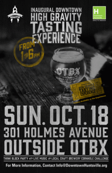 We are closing down Holmes Avenue in front of OTBX so you can sample some craft beer made in Alabama while enjoying local music and food trucks on a beautiful North Alabama Autumn day. Buy your tickets ahead of time so you can sample some of Alabama's best high gravity craft beer from breweries around the state. Online tickets purchased ahead of time will be 7 tickets for $18 (day of tickets will be 7 tickets for $20).