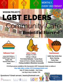 October's LGBT Elders Community Café is an affordable $16 and will be at the First United Methodist at 2100 J Street, Sacramento, CA 95816 from 6-8:30 p.m.