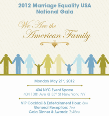 The 2012 Marriage Equality USA National Gala is Monday, May 21, held at the 404 NYC event space in the Chelsea neighborhood of Manhattan. This year's theme, "We Are the American Family," celebrates the diversity within LGBT families and supports Marriage Equality's continued work to preserve, expand and protect equality in our community. The evening begins with a VIP red-carpet cocktail hour featuring entertainment, delicious food, open bar, silent auction, and the opportunity to socialize with honorees and special guests. The main event will feature a seated 3-course dinner and awards will be presented to leading members of the movement including celebrity, corporate, political, media and community organizations.