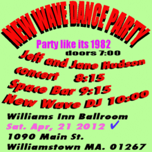 New Wave Dance Party Sat. Apr. 21, 2012 Williams Inn Ballroom 1090 Main St. Williamstown MA. Doors at 7:00 Jeff and Jane Hudson concert 8:15 Space Bar laptop and guitar 9:30 New Wave DJ 10:00 ALL ages welcome, Cash Bar 21 plus