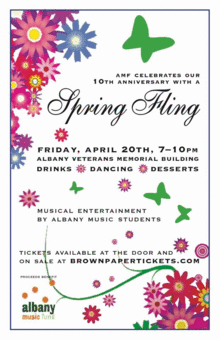 Please join us to celebrate Albany Music Fund's 10th Anniversary at the Spring Fling on Friday April 20th from 7-10 p.m. at Albany's own Veteran's Memorial Building.
