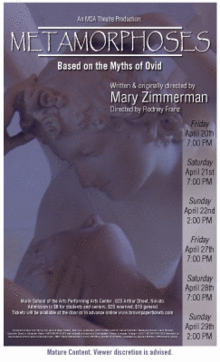 Based on Ovid's transformation myths, the play subtly mixes ancient Greek stories of pathos and tragedy with contemporary language, humor, and thought, all enacted in and around a large pool of water in the center of the stage. The themes of love, the inevitability of change, and the human ability to adapt to change are timeless, as is amply demonstrated by the sometimes eerie closeness of a vignette to the original lines from Ovid, which still manage to resonate with modern viewers. Time Magazine raves "...Zimmerman's lovely, deeply affecting work...shows that theater can provide not just escape but sometimes a glimpse of the divine." Due to mature themes, viewer discretion is advised.