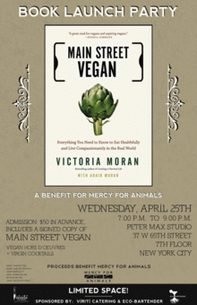 Come celebrate the launch of Victoria Moran's exciting new book, Main Street Vegan! Your ticket purchase will benefit Mercy for Animals. Mingle with fellow supporters at the Peter Max Studio (37 W 65th Street, 7th Floor, NYC), enjoy gourmet vegan nibbles by Vérité Catering, sip on delicious virgin cocktails by the Eco-Bartender, and enjoy live music by celebrated guitarist Bob Miles and his band.