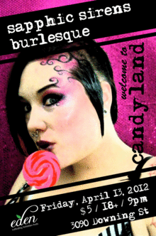 Denver, CO April 13, 2012 9pm Sapphic Sirens Burlesque with Lottie Dah presents "Welcome to Candyland" a one-of-a-kind burlesque extravaganza! Sapphic Sirens is a local women-centered burlesque collective featuring an assortment of burlesque beauties.