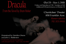 Chanticleer is proud to present "Dracula" based on the novel by Bram Stoker with Dramatization by Hamilton Deane and John L. Balderston This adaptation is of the classic thriller that marvelously balances the menace of the horror tale with sophisticated satire. Perfect for Chanticleer, given our predilection for housing bats. Performances on Friday and Saturday nights at 7:30 p.m. and Sunday matinees at 2:00 p.m. A special additional showing will be on Friday, October 30 at 10:30 PM