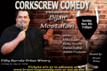 Corkscrew Comedy Presents: proudly brings Bijan Mostafavi to North County San Diego. Sunday November 8th ay Fifty Barrels Urban Winery in Vista, California. the show will begin at 7pm sharp and wwill include great up and coming talent including Reilly Hoeft, David Zafra, Aaron Frescas and featuring Mike Kadir. Hosted by Brian Riley.