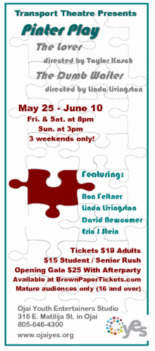 Ovation Award nominee Linda Livingston and David Newcomer star in The Lover, directed by Taylor Kasch. Then it's The Dumb Waiter, directed by Linda Livingston and starring Ron Feltner & Eric Stein. Pinter Play is for mature audiences only. $15 student & senior rush tickets available at the door.