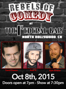 It's Rebels of Comedy at the Federal Bar in North Hollywood. Come out and see a night of live comedy, featuring an awesome lineup of professional features and headliner comedians. Kyle Kinane, Amir K, and Travis Owens. Featuring Barbara Gray, Josh Levesque