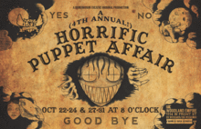 The puppets are returning to shock, scare, and satisfy your thirst for horror. Join your host, Hirmuta Dyn, for a puppet-cabaret filled with brand-new, original tales of horror: Cut Here written by Heidi Kraay, Ouija Bored and Space Crazy written by Erin Marie Chancer, The Woodwitches by Chad Ethan Shohet, A Breakfast Special by Jaime Nebeker, Puju Nantu (Black Moon) by Ashley Dowden, and more!
