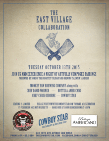 With Monkey Paw Brewing providing the beer, and David Warner --the executive chef of Bottega Americano-- joining us in providing the food, we are proud to showcase our little urban village in this one-night-only dinner event.