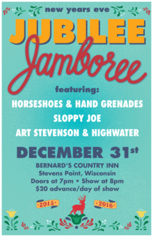 Ring in 2016 bluegrass style with Central Wisconsin's very own Horseshoes and Hand Grenades, Sloppy Joe, and Art Stevenson and High Water for a night of music and merriment in the Grand Ballroom of the time-honored Stevens Point classic, Bernard's Country Inn!