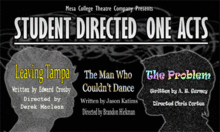 Featuring student directed one acts from The Problem by A.R. Gurney, directed by Chris Cortez. "A long term marriage is exposed for its' need for spontaneity, attention, and imagination." The Man Who Couldn't Dance by Jason Katims, directed by Brandon Hickman. "When Eric is reunited with his old flame, Gail, and has the chance to meet her baby, the two may finally experience closure." Leaving Tampa by Edward Crosby, directed by Derek Maclean. "Roy and his boyfriend Marc debate the validity of Roy's hatred towards his father, Wayne, a ghost that only Roy can see and hear, points out how Roy is becoming the man he's always hated."