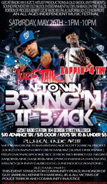 $10 advance, $15 at the door Ozcat Radio, Northbay Uprising, Old School Ent and Hitlist Productions Bring you "VTOWN BRINGIN IT BACK" memorial day weekend 1104 Georgia St Vallejo Ca 94590!! With these Vallejo headliners (Evening, 7pm to 10) * Turf Talk * Cadazone * RichB4Rich * Down & Dirty with star support from * Rappin Fort'e * Spookie Sicc * Peezy * Hollywood King * Ms. B. * Undagod * Donnie Smacks and special guests DOE-EZ! All The Way from King County; Washington