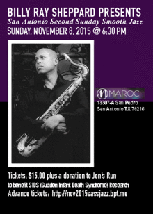 In November, BillyRay Sheppard shares his brand of smooth jazz with some of the best musicians in San Antonio in a beautiful and unique environment. This month's concert will benefit Jon's Run. Annually Jon's Run generates revenue and awareness for Sudden Infant Death Syndrome (SIDS) research.