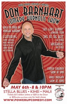 Back by popular demand, Power Up Comedy Presents The Don Barnhart Comedy Hypnosis Show at Stella Blues Cafe in Kihei, Maui.