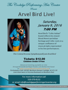 Arvel returns to the Coolidge Performing Arts Center with his unique music and story telling for a beautiful, yet compelling concert featuring the Central Arizona Symphony. We are pleased to have him return for this unique all ages concert!