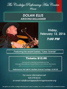 Dolan Ellis has been Arizona's Official State Balladeer for 47 years, under the appointment of twelve Arizona Governors. While exploring the little known corners of this state in his specially equipped four wheel drive vehicles, and researching the legends and historical events that he writes and sings about, he has logged over a million Arizona miles on his Jeeps. He is also an expert photographer, and uses his large screen photography (now digital) to illustrate his Arizona ballads during many of his appearances. Dolan is the founder of The Arizona Folklore Preserve in Ramsey Canyon, which is now owned by the State of Arizona and The University of Arizona South. The AFP is administrated by the The Arizona Folklore Preserve Board of Directors. As an original member of the famous folk singing group, The New Christy Minstrels, Dolan has earned several gold records, as well as earning a coveted Grammy Award while with that group. Today, Dolan is currently touring nationally with the NCM, in addition to fulfilling his busy performance schedule as "The Balladeer". While with the NCM, he recently performed at the Chautauqua Performing Arts Center in New York State, as well as the Palace of Fine Arts in San Francisco and B.B. King's in NYC. As Arizona's Official State Balladeer, he has sung his ballads in more than twenty countries of the world and he continues to tour frequently with his one man "Arizona Experience" show. Dolan Ellis and his work have been entered into the United States Congressional Record, where he has been recognized as an "Arizona Treasure", by Senator John McCain. After many years of dedication to his work, Dolan Ellis and his music have become synonymous with Arizona, its lands, and its people.